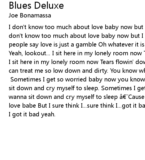 | I don' t know too much about love baby now but I sure think I got it bad yeah. I don' t know too much about love baby now but I sure think I got it bad yeah. Some people say love is just a gamble Oh whatever it is about to drive me mad yeah. Yeah, lookout... I sit here in my lonely room now Tears flowin' down my eyes. As I sit here in my lonely room now Tears flowin' down my eyes. I wonder how you can treat me so low down and dirty. You know what? Your heart must be made out of ice yeah. Lead Break Sometimes I get so worried baby now you know I wanna sit down and cry myself to sleep. Sometimes I get so worried baby now you know I wanna sit down and cry myself to sleep Cause I don' t know too much about love babe But I sure think I... sure think I... got it bad yeah. Oh, I sure think I got it bad yeah. |
