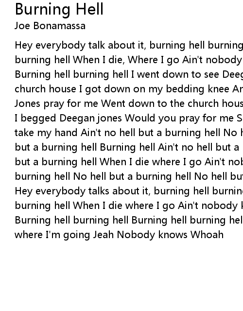 Hey everybody talk about it, burning hell burning hell Ain't no hell but a burning hell When I die, Where I go Ain't nobody know Burning hell burning hell Burning hell burning hell I went down to see Deegan jones Who was down at the church house I got down on my bedding knee And I prayed and I prayed Deegan Jones pray for me Went down to the church house Got down at my bedding knee And I begged Deegan jones Would you pray for me She said sir take my hand Said sir take my hand Ain't no hell but a burning hell No hell but a burning hell No hell but a burning hell Burning hell Ain't no hell but a burning hell Ain't no hell but a burning hell When I die where I go Ain't nobody knows Ain't no hell but a burning hell No hell but a burning hell No hell but a burning hell Burning hell Hey everybody talks about it, burning hell burning hell Ain't no hell but a burning hell When I die where I go Ain't nobody knows Burning hell burning hell Burning hell burning hell Burning hell burning hell Burning hell Don't know where I'm going Jeah Nobody knows Whoah |