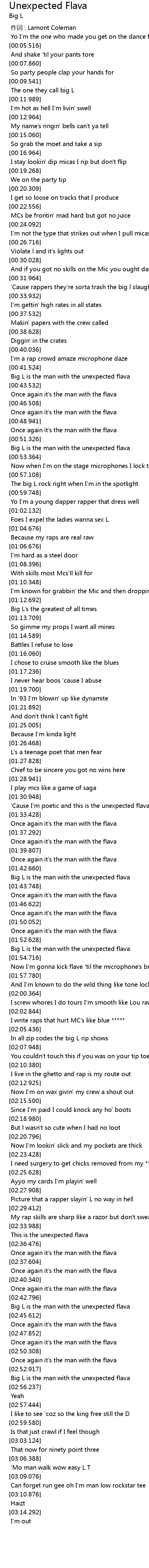 | [00:42.980] | Big L is the man with the unexpected flava |