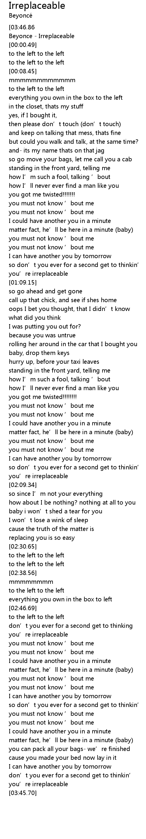 | [00:00.00] | Beyonce Irreplaceable |