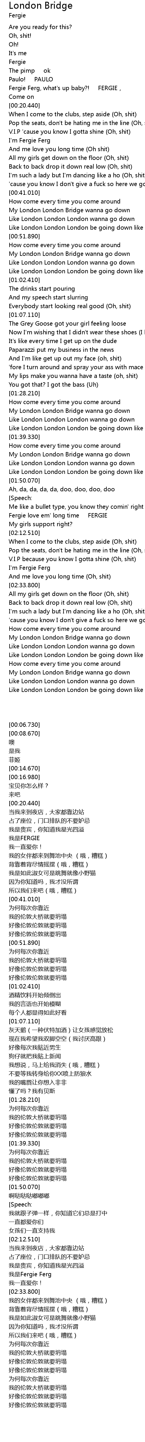 | [00:18.370] | Fergie Ferg, what' s up baby?! FERGIE, |