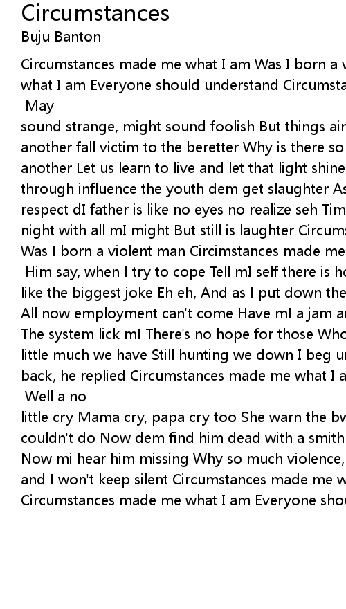 Circumstances made me what I am Was I born a violent man Circumstances made me what I am Everyone should understand Circumstances made me what I am Was I born a violent man Circumstances made me what I am Everyone should know [Verse 1] May sound strange, might sound foolish But things ain't getting better Everyday another fall victim to the beretter Why is there so much violence Killing we one another Let us learn to live and let that light shine brighter Bad influence through influence the youth dem get slaughter As bad as badman use to be Dem respect dI father is like no eyes no realize seh Times get harder MI talk all night with all mI might But still is laughter Circumstances made me what I am Was I born a violent man Circimstances made me what I am And everyone should know [Verse 2] Him say, when I try to cope Tell mI self there is hope It seems like the biggest joke Eh eh, And as I put down the gun Still dollars must run All now employment can't come Have mI a jam and a cool Want go back in a school The system lick mI There's no hope for those Who have not from the slum Take dI little much we have Still hunting we down I beg unu show some love Unu wI get back, he replied Circumstances made me what I am Was I born a violent man Circimstances made me what I am And everyone should know [Verse 3] Well a no little cry Mama cry, papa cry too She warn the bwoy wth all heart And that couldn't do Now dem find him dead with a smith and wesson Six weeks and change Now mi hear him missing Why so much violence, too much violence It hurts my soul and I won't keep silent Circumstances made me what I am That was his reply I cry Circumstances made me what I am Everyone should know [Repeat verse 1] |