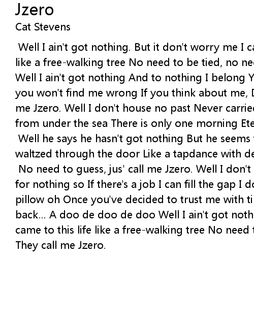 [Jzero:] Well I ain't got nothing. But it don't worry me I came to this life like a free-walking tree No need to be tied, no need to be-- They call me Jzero Well I ain't got nothing And to nothing I belong You won't find me right, Yet you won't find me wrong If you think about me, Don't thing too long-- Jus' call me Jzero. Well I don't house no past Never carried a key My sun doesn't rise from under the sea There is only one morning Eternally...dee d'lee d'lee [Polygons:] Well he says he hasn't got nothing But he seems to possess less He waltzed through the door Like a tapdance with death What kind of fool is he? [Jzero:] No need to guess, jus' call me Jzero. Well I don't eat a lot I do work for nothing so If there's a job I can fill the gap I don't need a room, bed or pillow oh Once you've decided to trust me with time You won't need to look back... A doo de doo de doo Well I ain't got nothing, But it don't worry me I came to this life like a free-walking tree No need to be tied, no need to be-- They call me Jzero. |