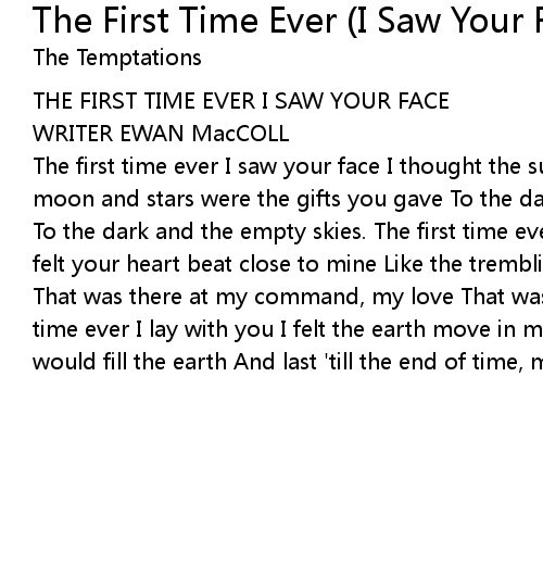 The first time ever I saw your face I thought the sun rose in your eyes And the moon and stars were the gifts you gave To the dark and the empty skies, my love, To the dark and the empty skies. The first time ever I kissed your mouth And felt your heart beat close to mine Like the trembling heart of a captive bird That was there at my command, my love That was there at my command. The first time ever I lay with you I felt the earth move in my hand I thought our joy would fill the earth And last 'till the end of time, my love, And last |