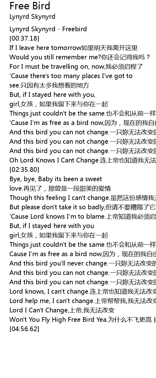| [04:48.86] | Won' t You Fly High Free Bird Yea. wèi shí me bù fēi gèng gāo zì yóu niǎo |