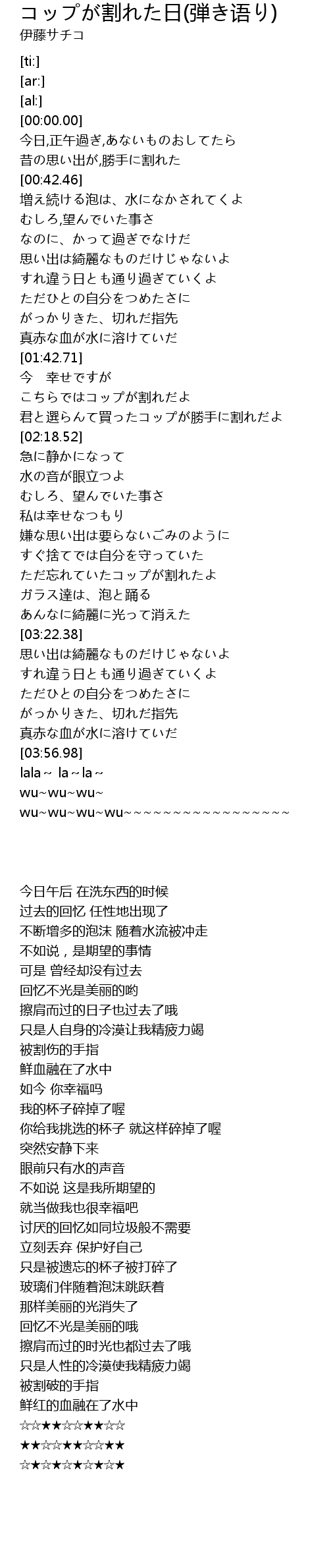 | [03:00.07] | ただ忘れていたコップが割れたよ |