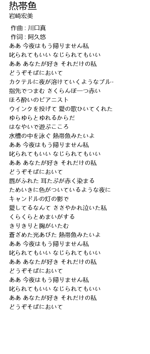 | [02:29.00] | 蒼ざめた光あびた 熱帯魚みたいよ |