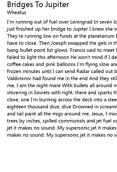 I'm running out of fuel over Leningrad In seven lonely hours I'll be gone. She just finished up her bridge to Jupiter I knew she would make it all along. They're running low on funds at the planetarium In seven winter months they'll have to close. Then Joesph swapped the gels in the west project So now the big bang bullet point list glows. Francis said to meet him near the gift shop And Io failed to light this afternoon He won't mind if I decide to fix her Skip the coffee cakes and pink balloons I'm flying slow and low over the urals thirty frozen minutes until I can send Radar called out bogeys west of ussuriysk And Valdimirov had found me in the end And they still don't see Cause the don't know me, I am the night mare With bullets all around me in the cold, sun and shivering in Soviets with right, there and sparks this goddamn dog fight is a close, one I'm burning across the deck into a steep, climb Then rollover at eighteen thousand dive, dive Drowned in screaming tracers when I drop, brakes and tail paint all the migs around me, Jesus, I missed those fucking Christmas trees by inches, spilled communists and jet fuel on the ground. My supersonic jet it makes no sound. My supersonic jet it makes no sound. My supersonic jet it makes no sound. My supersonic jet it makes no sound. |