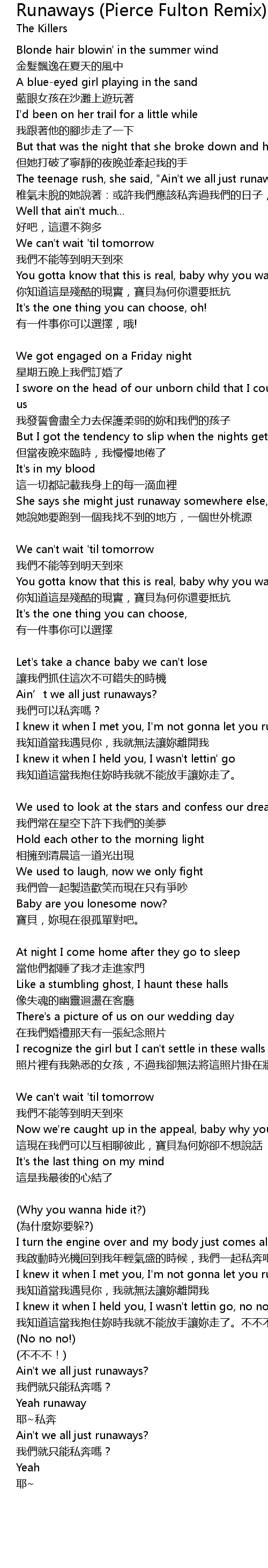 | The teenage rush, she said, " Ain' t we all just runaways, we got time" | |