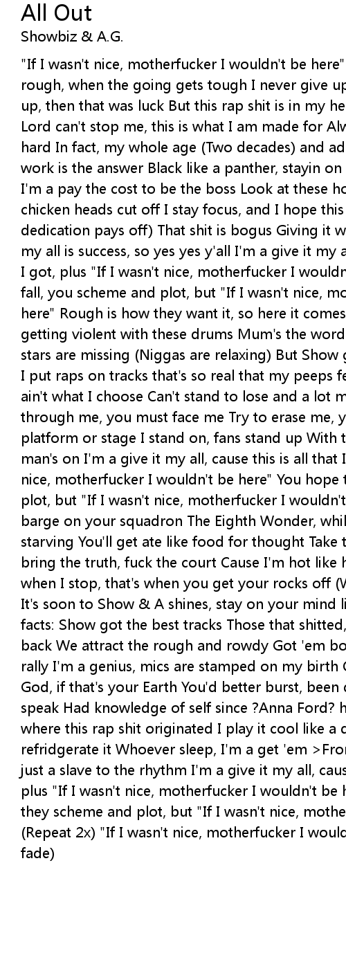 "If I wasn't nice, motherfucker I wouldn't be here" - Redman (Repeat 4x) I'm rough, when the going gets tough I never give up If you survive where we grew up, then that was luck But this rap shit is in my heart to the core Even the Lord can't stop me, this is what I am made for Always had to struggle, shit is hard In fact, my whole age (Two decades) and add four years to that But hard work is the answer Black like a panther, stayin on my toes like a ballet dancer I'm a pay the cost to be the boss Look at these hoes bouncing, with their chicken heads cut off I stay focus, and I hope this dedication (I know that this dedication pays off) That shit is bogus Giving it what I got, I won't fall Cause my all is success, so yes yes y'all I'm a give it my all, cause this is all that I got, plus "If I wasn't nice, motherfucker I wouldn't be here" You hope that we fall, you scheme and plot, but "If I wasn't nice, motherfucker I wouldn't be here" Rough is how they want it, so here it comes All sons get silent, I'm getting violent with these drums Mum's the word, you heard us in action A lot of stars are missing (Niggas are relaxing) But Show gets ill with his street skills I put raps on tracks that's so real that my peeps feel I got to make it, blues ain't what I choose Can't stand to lose and a lot more to prove So truly, to go through me, you must face me Try to erase me, you'd better bring your toolie Any platform or stage I stand on, fans stand up With their hands up because the man's on I'm a give it my all, cause this is all that I got, plus "If I wasn't nice, motherfucker I wouldn't be here" You hope that we fall, you scheme and plot, but "If I wasn't nice, motherfucker I wouldn't be here" Pardon, while I barge on your squadron The Eighth Wonder, while you stay in hunger, ideas be starving You'll get ate like food for thought Take these melodies, we gonna bring the truth, fuck the court Cause I'm hot like hot sauce Juice like Mott's, when I stop, that's when you get your rocks off (Wack?) That's a rumor (In fact) It's soon to Show & A shines, stay on your mind like a brain tumor Here's the facts: Show got the best tracks Those that shitted, they gots to get it from the back We attract the rough and rowdy Got 'em bottom of the nineth, time for the rally I'm a genius, mics are stamped on my birth Cover your girl, and be forth God, if that's your Earth You'd better burst, been deep since you've heard me speak Had knowledge of self since ?Anna Ford? had his belts >From the place where this rap shit originated I play it cool like a dairy, so just hear me and refridgerate it Whoever sleep, I'm a get 'em >From the cradle to the grave I'm just a slave to the rhythm I'm a give it my all, cause this is all that I got, plus "If I wasn't nice, motherfucker I wouldn't be here" You hope that we fall, they scheme and plot, but "If I wasn't nice, motherfucker I wouldn't be here" (Repeat 2x) "If I wasn't nice, motherfucker I wouldn't be here" (Repeat til fade) |