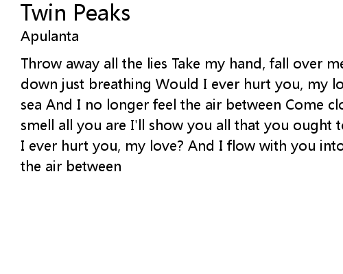 | Throw away all the lies Take my hand, fall over me Into the place where we lie down just breathing Would I ever hurt you, my love? And I flow with you into the sea And I no longer feel the air between Come closer, don't look back Let me smell all you are I'll show you all that you ought to see, just breathing Could I ever hurt you, my love? And I flow with you into the sea And I no longer feel the air between |