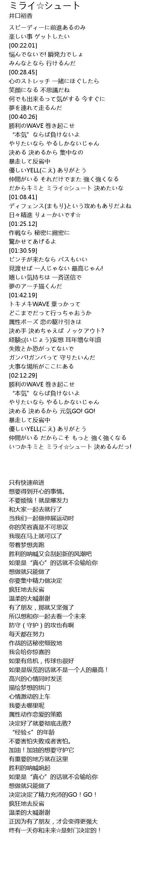 | [01:04.30] | だからキミと ミライ☆シュート 決めたいな |