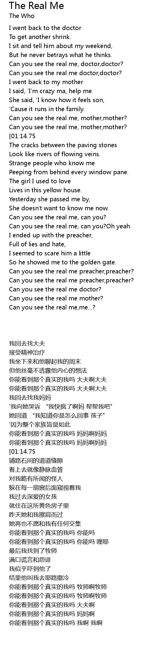 | [01:18.88][01:14.75] | Can you see,can you see the real me? |