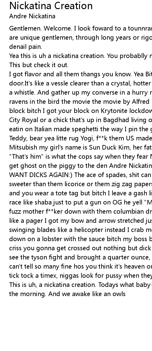 I got flavor and all them thangs you know. Yea Bitch suck a dick or hit the door.It's like a vessle clearer than a crystal, hotter than a pistol, man I give a whistle. And gather up my converse in a hurry niggas flock together like ravens in the bird the movie the movie by Alfred Hitchcock Bitch I got your block bitch I got your block on Krytonite lockdown and worship like a Kansas City Royal or a chick that's up in Bagdhad living of of oil, Rough and ready eatin on Italian made speghetti the way I pin the grass mothaf**kers call mr Teddy, bear yea litte rug Yogi, f**k them US made TV's I'd rather f**k with Sony Mitsubish my girl's name is Sun Duck Kim, her father is the president of IBM "That's him" is what the cops say when they fear Nicky I'm thinking cash burns I get ghost on the piggy to the den Andre Nickatina all in A NIGGA MAKING DIKES WANT DICKS AGAIN:) The ace of spades, shit can get colder than a glacier But sweeter than them licorice or them zig zag papers yous a scalywag you wait for? and you wear a tote tag but bitch I leave a gash like a 44 mag real dash-board I race like shaba just to put a gun on OG he yell "Mama daddy" someone call the fuzz mother f**ker down with them columbian drugs I'm not a savior shit vibrates like a pager I got my bow and arrow stretched just aim her something propper, swinging blades like a helicopter instead I crab meat spend my cash and chow down on a lobster with the sauce bitch my boss back and get raw f**king with criss you gonna get crossed out nothing but dick in your mouth went to vegas to see the tyson fight and brought a quarter ounce, to smoke to sell, you really can't tell so many fine hos you think it's heaven or hell, you pick, my timer tick tock a timex, niggas look for pussy when they can't find sex. |