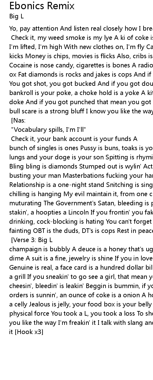 Yo, pay attention And listen real closely how I break this slang shit down [Verse 1: Big L] Check it, my weed smoke is my lye A ki of coke is a pie When I'm lifted, I'm high With new clothes on, I'm fly Cars is whips and sneakers is kicks Money is chips, movies is flicks Also, cribs is homes, jacks is pay phones Cocaine is nose candy, cigarettes is bones A radio is a box, a razor blade is a ox Fat diamonds is rocks and jakes is cops And if you got rubbed, you got stuck You got shot, you got bucked And if you got double-crossed, you got fucked Your bankroll is your poke, a choke hold is a yoke A kite is a note, a con is a okey doke And if you got punched that mean you got snuffed To clean is to buff, a bull scare is a strong bluff I know you like the way I'm freakin' it I talk with slang and I'm a never stop speakin' it [Hook: x2] [Nas:] "Speak with criminal slang" That's just the way that I talk, yo [Nas:] "Vocabulary spills, I'm I'll" Remix Rex dawg, uh [Verse 2: T-Rex] Check it, your bank account is your funds A bunch of singles is ones Pussy is buns, toaks is your gun Your smoke box is your lungs and your doge is your son Spitting is rhyming, the bing is the island Bling bling is diamonds Stumped out is wylin' Acting silly is childish Beef is busting your man Masterbations fucking your hand The plot is a gun and a plan Relationship is a one-night stand Snitching is singing Fighting is banging, chilling is hanging My evil maintain it, from one crew to the next they're muturating The Government's Satan, bleeding is payin' If you fly then you're stakin', a hoopties a Lincoln If you frontin' you faking, cops is bacon Pussy is drinking, cock-blocking is hating You can't forget if you fall then you're fainting OBT is the duds, DT's is cops Rest in peace TO Big L, man your soul never rot OGT [Hook x2] [Verse 3: Big L] The iron horse is the train and champaign is bubbly A deuce is a honey that's ugly If your girl is fine, she's a dime A suit is a fine, jewelry is shine If you in love, that mean you blind Genuine is real, a face card is a hundred dollar bill A very hard, long stare is a grill If you sneakin' to go see a girl, that mean you creepin' Smilin' is cheesin', bleedin' is leakin' Beggin is bummin, if you nuttin you comin Takin' orders is sunnin', an ounce of coke is a onion A hotel's a telly, a cell phone's a celly Jealous is jelly, your food box is your belly To guerrilla mean to use physical force You took a L, you took a loss To show off mean floss, uh I know you like the way I'm freakin' it I talk with slang and I'm a never stop speakin' it [Hook x3] |