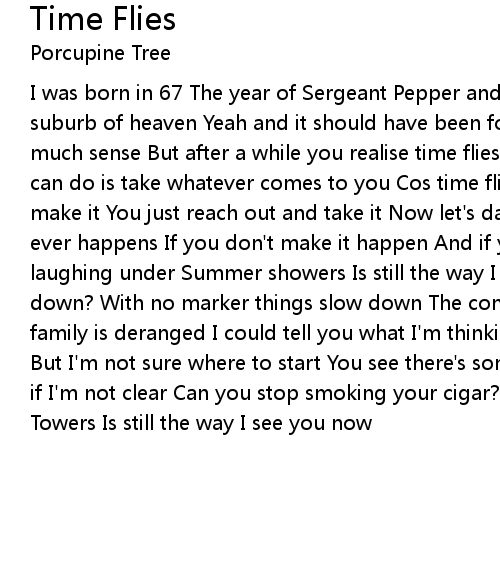 I was born in 67 The year of Sergeant Pepper and Are You Experienced? Into a suburb of heaven Yeah and it should have been forever It all seemed to make so much sense But after a while you realise time flies And the best thing that you can do is take whatever comes to you Cos time flies She said luck is all you make it You just reach out and take it Now let's dance a while She said nothing ever happens If you don't make it happen And if you can't laugh then smile And laughing under Summer showers Is still the way I see you now How does time break down? With no marker things slow down The conference of the strange And your family is deranged I could tell you what I'm thinking While we sit here drinking But I'm not sure where to start You see there's something wrong here I'm sorry if I'm not clear Can you stop smoking your cigar? And the coat you wore to Alton Towers Is still the way I see you now |