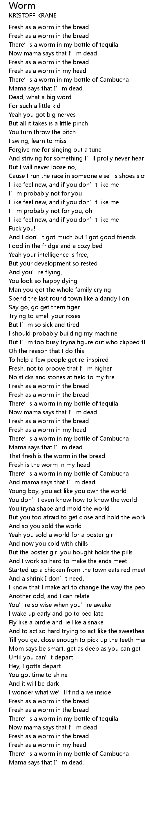 | Fresh as a worm in my head | |