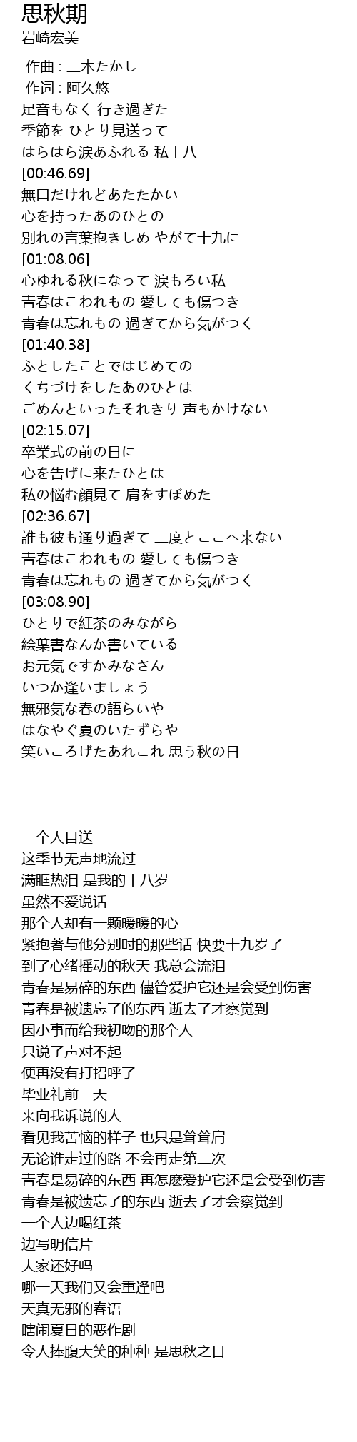 | [03:46.18] | 笑いころげたあれこれ 思う秋の日 |