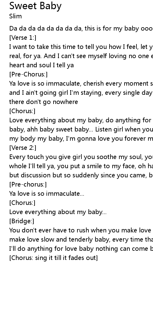 Love everything about my baby, do anything for my baby, lay down my life for my baby, ahh baby sweet baby... Listen girl when you kiss me baby, send chills down my body my baby, I'm gonna love you forever my baby, ahh baby sweet baby |