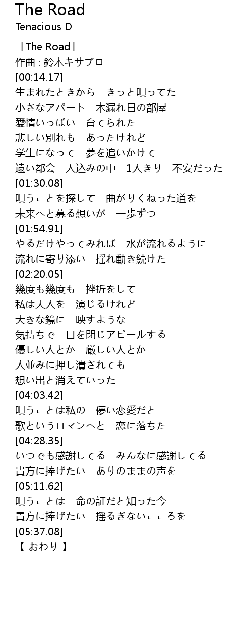 | [01:32.48] | 唄うことを探して 曲がりくねった道を |