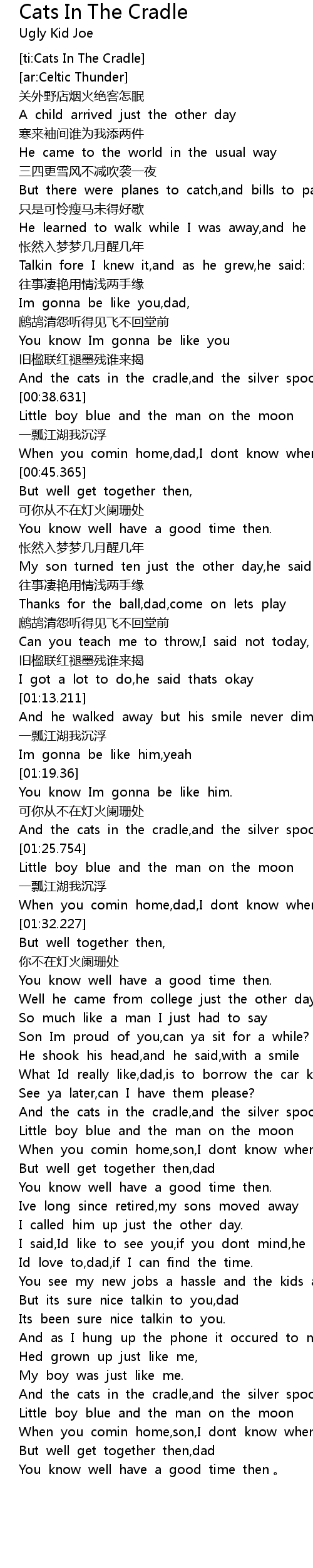 | [00:36.181] | And the cats in the cradle,and the silver spoon |