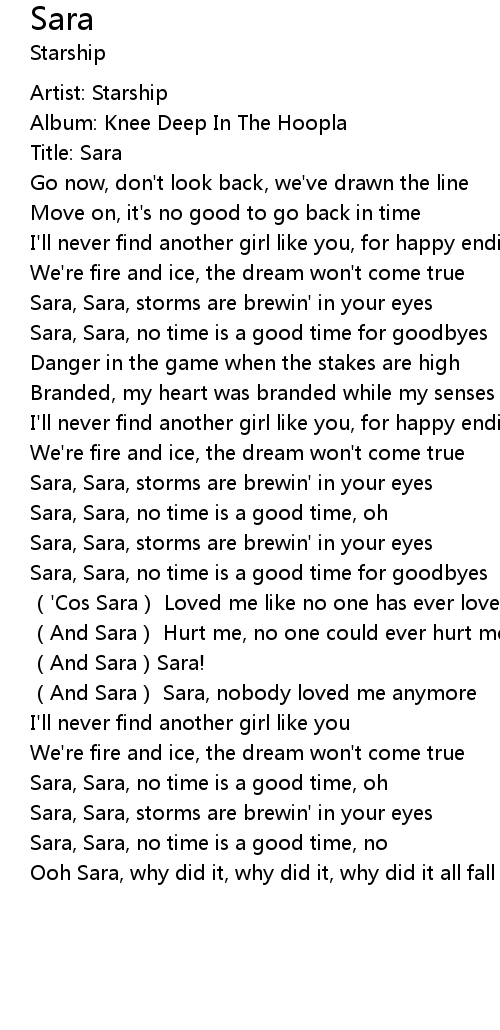 | [01:46.69] | Sara, Sara, storms are brewin' in your eyes |