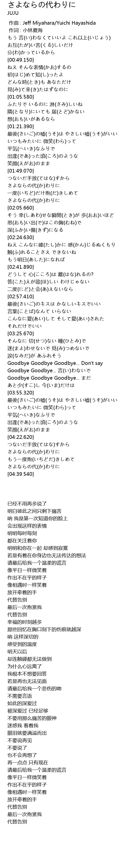 | [04:23.300] | つないだ手放(てはな)すから さよならの代(か)わりに |