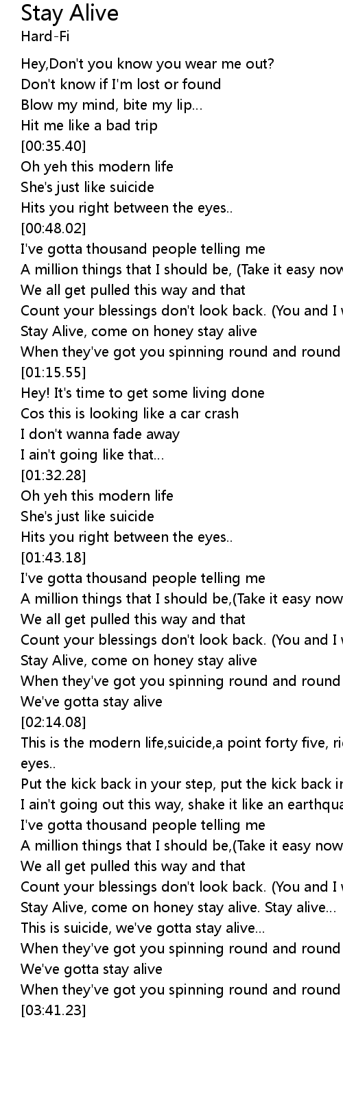 | [01:59.79] | Stay Alive, come on honey stay alive |