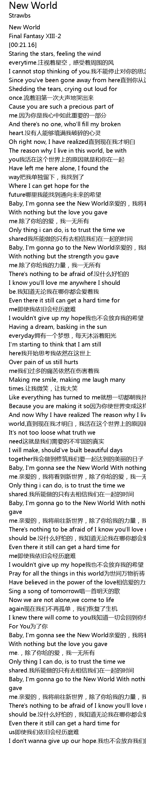 | [03:12.47] | Baby, I' m gonna go to the New World With nothing but the strength you gave me. qin ai de, wo jiang qian wang xin shi jie, chu le ni gei wo de li liang, wo yi wu suo you |