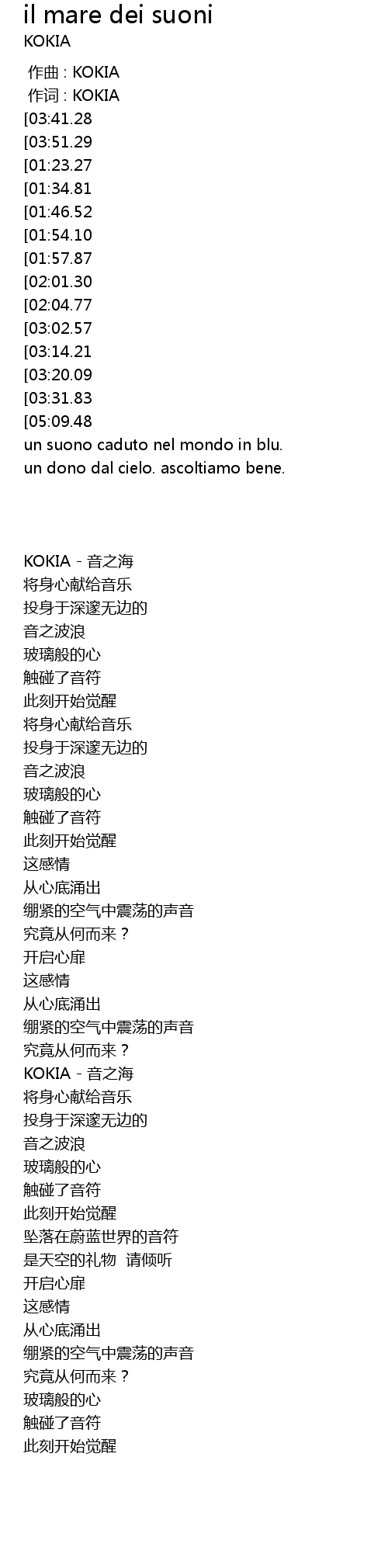 | [00:22.00][03:41.28] | KOKIAIl mare dei suoni |