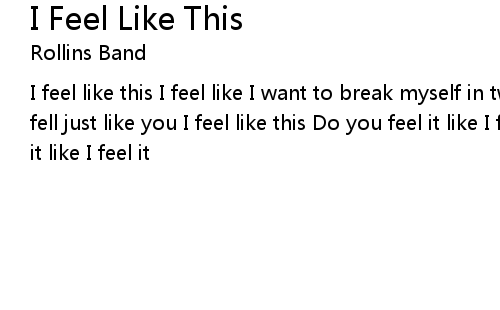 | I feel like this I feel like I want to break myself in two I feel like I want to fell just like you I feel like this Do you feel it like I feel it Can you feel it like I feel it |
