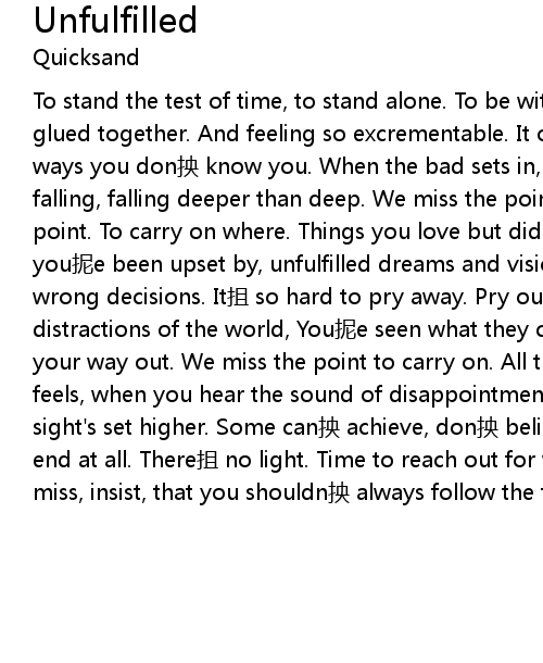 | To stand the test of time, to stand alone. To be without the glue, that keeps us glued together. And feeling so excrementable. It only goes to show you, how many ways you don yāng know you. When the bad sets in, I could use some sleep. Resting, falling, falling deeper than deep. We miss the point to carry on, we miss the point. To carry on where. Things you love but did not get. And all the times you nǐ e been upset by, unfulfilled dreams and visions, and the guilt for your wrong decisions. It zhā so hard to pry away. Pry out from under all the lies, and distractions of the world, You nǐ e seen what they can do, but you can yāng see your way out. We miss the point to carry on. All thing fall through. That how it feels, when you hear the sound of disappointment. So unsatisfied, when the sight' s set higher. Some can yāng achieve, don yāng believe, there is light at the end at all. There zhā no light. Time to reach out for what zhā real, it zhā easy to miss, insist, that you shouldn yāng always follow the first thing you feel. |