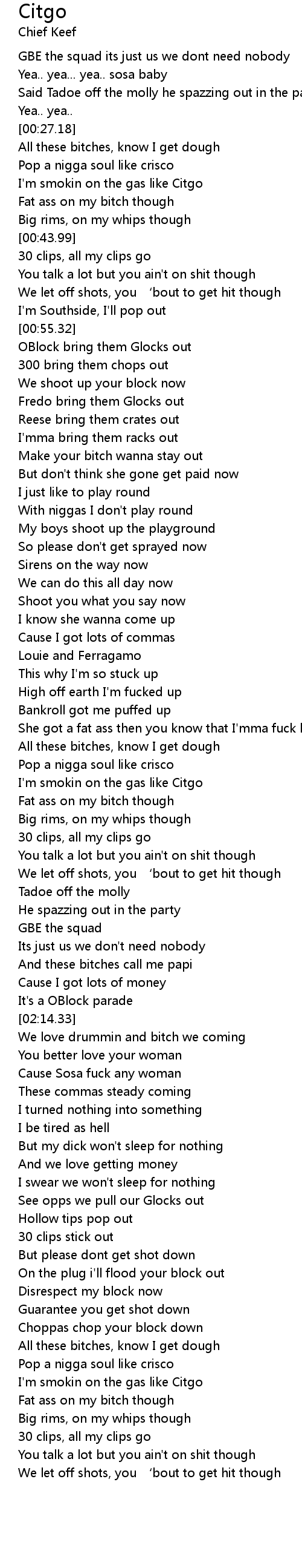 | [00:34.12] | I'm smokin on the gas like Citgo |