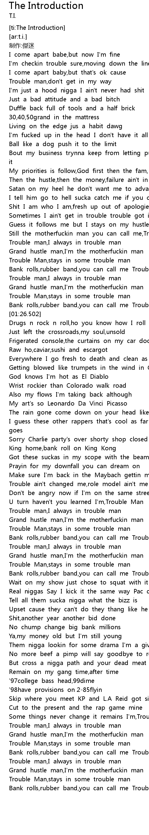 | [03:34.694] | Bank rolls, rubber band, you can call me Trouble Man |