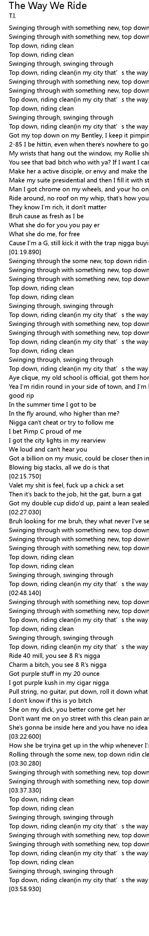 | [03:52.360] | Top down, riding clean in my city that' s the way we ride |