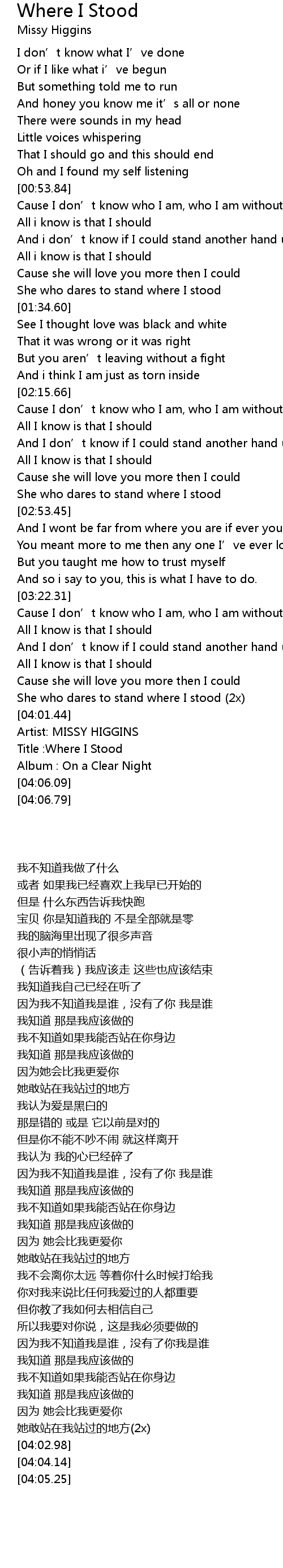| [04:04.14] | Title :Where I Stood |