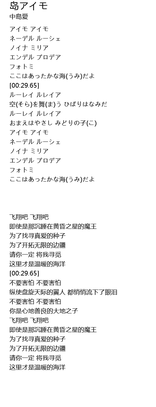 | [01:13.93] | ここはあったかな海(うみ)だよ |