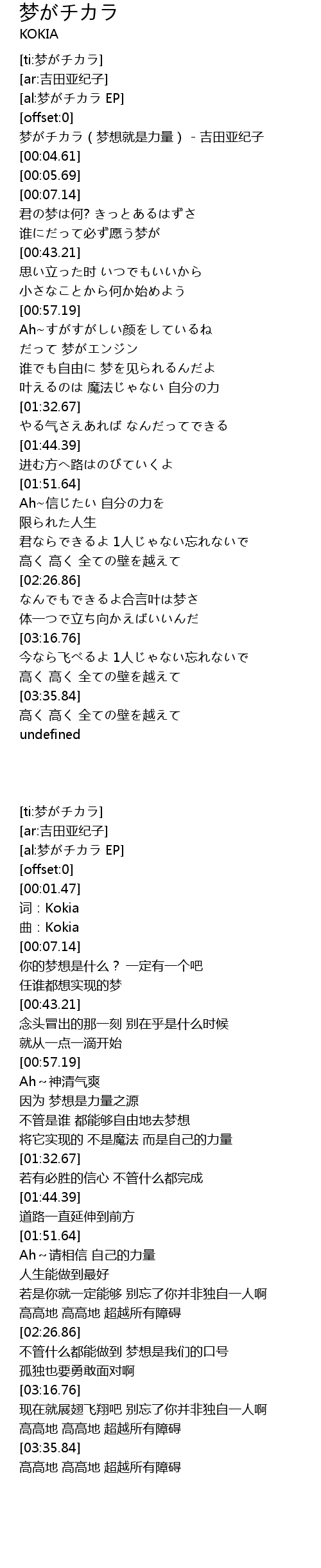 | [00:01.47] | 梦がチカラ(梦想就是力量) - 吉田亚纪子 |