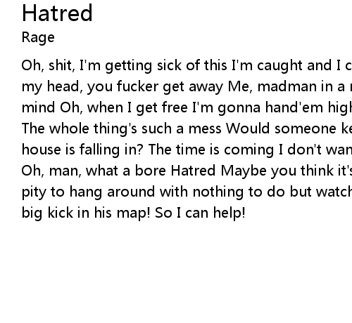 Oh, shit, I'm getting sick of this I'm caught and I can't escape It's gonna blow my head, you fucker get away Me, madman in a rage I hit the ceiling outta my mind Oh, when I get free I'm gonna hand'em high Hatred Oh, baby, it's too unfair The whole thing's such a mess Would someone keep the door locked up When the house is falling in? The time is coming I don't want no more I should believe in Oh, man, what a bore Hatred Maybe you think it's alright, well But ain't it a pity to hang around with nothing to do but watching it? Maybe someone needs a big kick in his map! So I can help! |