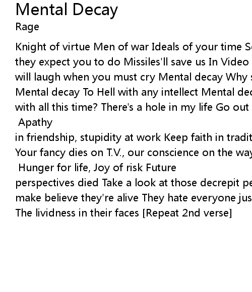 Knight of virtue Men of war Ideals of your time Sense of duty You've done what they expect you to do Missiles'll save us In Video games they do Mental decay I will laugh when you must cry Mental decay Why should I know the reason why Mental decay To Hell with any intellect Mental decay (Mental decay) What to do with all this time? There's a hole in my life Go out hunting The pleasure to kill Don't like strangers Without beer I've got no fun [Repeat 2nd verse] Apathy in friendship, stupidity at work Keep faith in tradition, the orders from above Your fancy dies on T.V., our conscience on the way You'll be vegetating right up to your final day [Repeat 1st verse] Hunger for life, Joy of risk Future perspectives died Take a look at those decrepit pensioners They fuss around to make believe they're alive They hate everyone just because they're all so young The lividness in their faces [Repeat 2nd verse] |