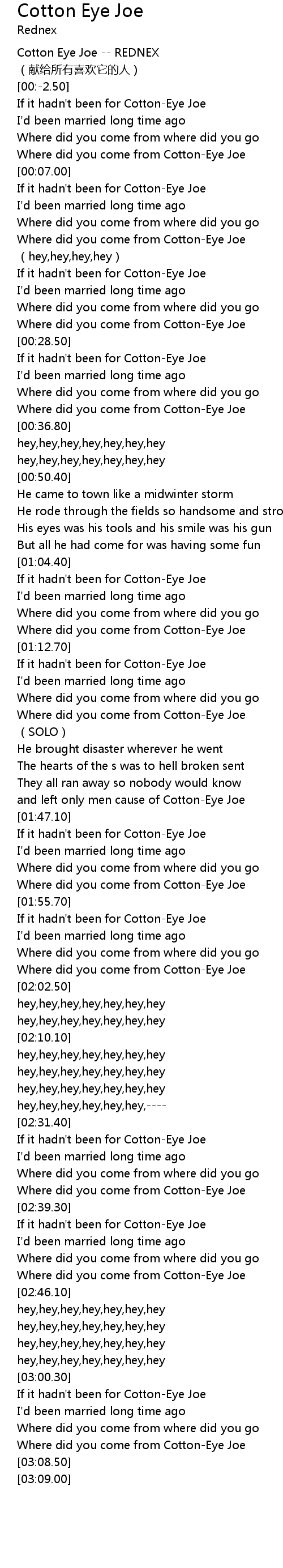 | [03:07.10] | Where did you come from Cotton-Eye Joe |