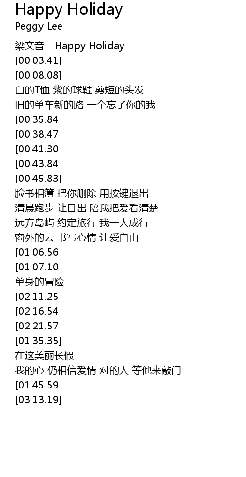 | [00:01.12] | liáng wén yīn Happy Holiday |