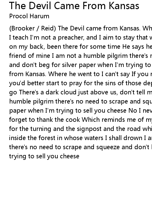 (Brooker / Reid) The Devil came from Kansas. Where he went to I can't say Though I teach I'm not a preacher, and I aim to stay that way There's a monkey riding on my back, been there for some time He says he knows me very well but he's no friend of mine I am not a humble pilgrim there's no need to scrape and squeeze and don't beg for silver paper when I'm trying to sell you cheese The Devil came from Kansas. Where he went to I can't say If you really are my brother then you'd better start to pray for the sins of those departed and the ones about to go There's a dark cloud just above us, don't tell me 'cos I know I am not a humble pilgrim there's no need to scrape and squeeze and don't beg for silver paper when I'm trying to sell you cheese No I never came from Kansas, don't forget to thank the cook Which reminds me of my duty: I was lost and now I look for the turning and the signpost and the road which takes you down to that pool inside the forest in whose waters I shall drown I am not a humble pilgrim there's no need to scrape and squeeze and don't beg for silver paper when I'm trying to sell you cheese |