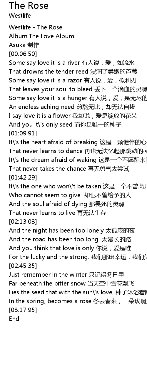 | [03:09.68] | In the spring, becomes a rose 冬去春来,一朵玫瑰,娇艳盛开 |