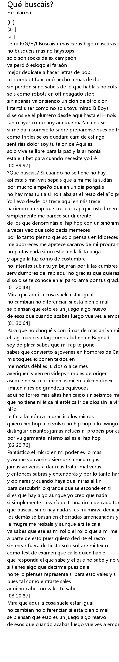| [00:01.77] | Letra F G H I Buscá is rimas caras bajo mascaras dará s en el bloc |