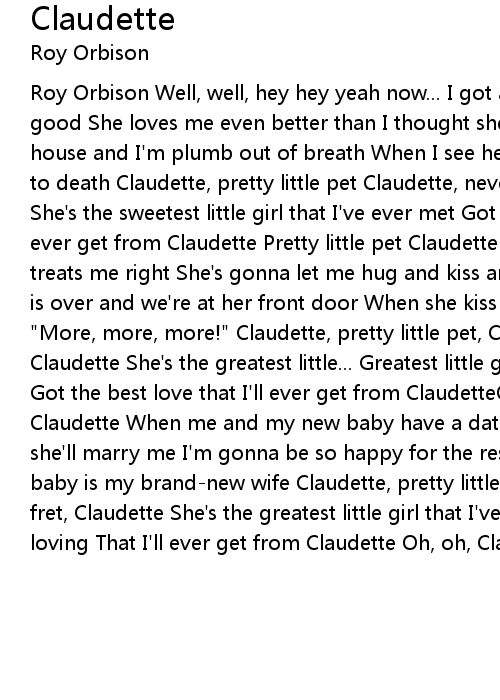 Roy Orbison Well, well, hey hey yeah now... I got a brand-new baby and I feel so good She loves me even better than I thought she would I'm on my way to her house and I'm plumb out of breath When I see her tonight, I'm gonna squeeze her to death Claudette, pretty little pet Claudette, never make me fret, Claudette She's the sweetest little girl that I've ever met Got the best love that I'll ever get from Claudette Pretty little pet Claudette Well I'm a lucky man My baby treats me right She's gonna let me hug and kiss and hold her tight When the date is over and we're at her front door When she kiss me goodnight I'll holler "More, more, more!" Claudette, pretty little pet, Claudette Never make me fret, Claudette She's the greatest little... Greatest little girl that I've ever met Got the best love that I'll ever get from ClaudetteOh, oh, Claudette Yea, Yeah, Claudette When me and my new baby have a date or three I'm gonna ask my baby if she'll marry me I'm gonna be so happy for the rest of my life When my brand-new baby is my brand-new wife Claudette, pretty little pet, Claudette Never make me fret, Claudette She's the greatest little girl that I've ever met Get the best loving That I'll ever get from Claudette Oh, oh, Claudette Yea, Yeah, Claudette |