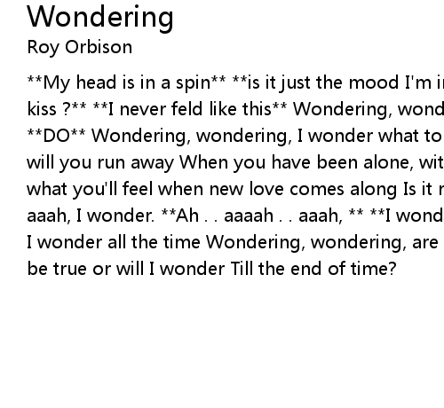 **My head is in a spin** **is it just the mood I'm in ?** **could it be your kiss ?** **I never feld like this** Wondering, wondering, I wonder what to **DO** Wondering, wondering, I wonder what to **SAY** Will your love be true, or will you run away When you have been alone, without love all alone You wonder what you'll feel when new love comes along Is it really real? Ah . . aaaah . . aaah, I wonder. **Ah . . aaaah . . aaah, ** **I wonder.** Wondering, wondering, I wonder all the time Wondering, wondering, are you really mine? Will your love be true or will I wonder Till the end of time? |
