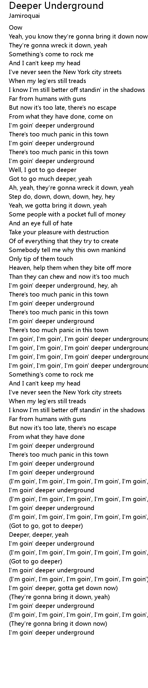I'm goin', I'm goin', I'm goin' deeper underground |