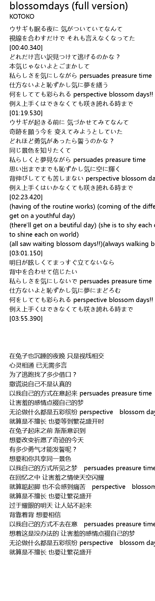 | [02:10.200] | 背伸びしてても苦しまない perspective blossom days!! |