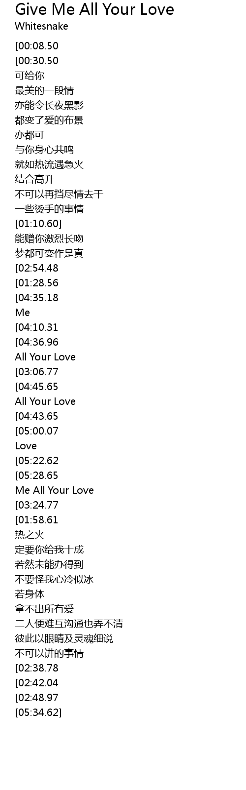 | [04:56.05][04:45.65][04:41.65][03:12.78][03:08.78][01:44.56][01:40.54] | Give Me All Your Love |